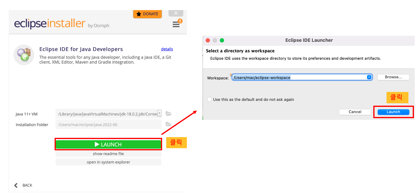 설치완료되면 Launch를 누르고 작업한 코드가 저장될 위치를 입력한다.