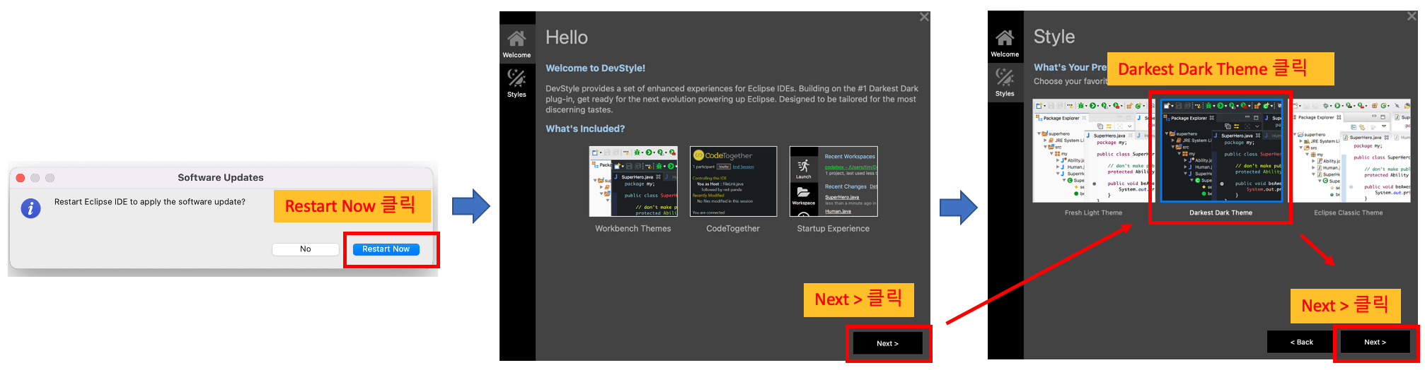 이클립스를 정상적으로 설치완료 했다면 눈의 피로도를 줄이기 위해 다크 테마를 적용해본다.