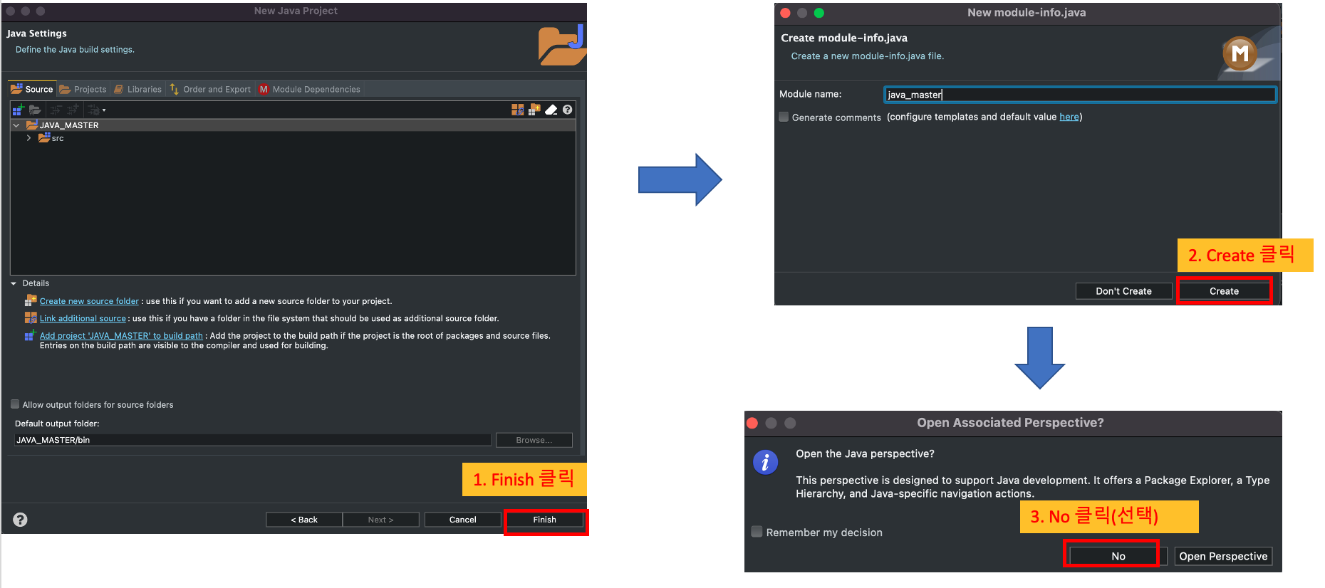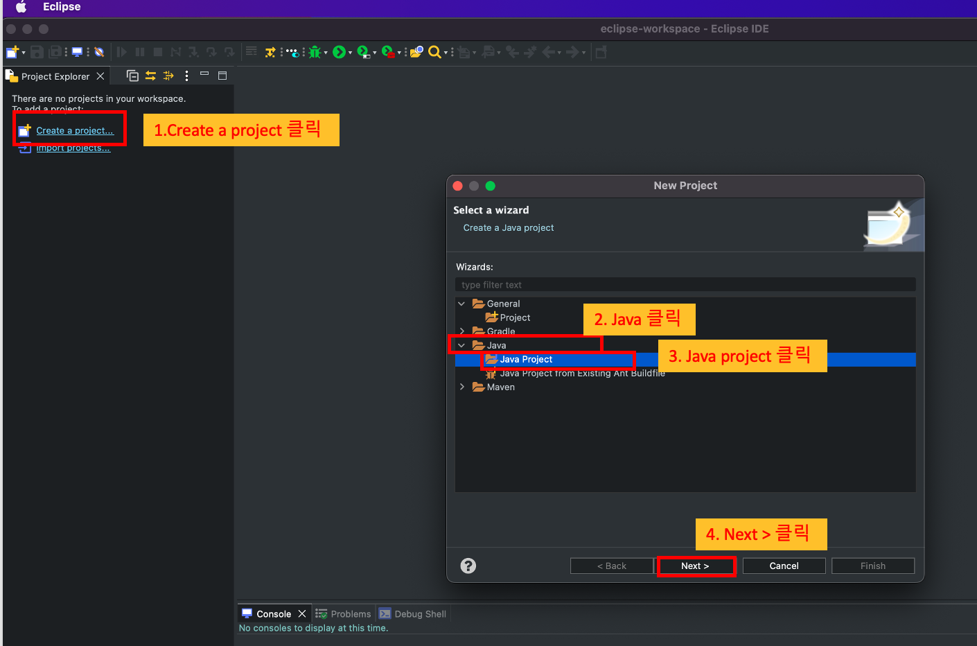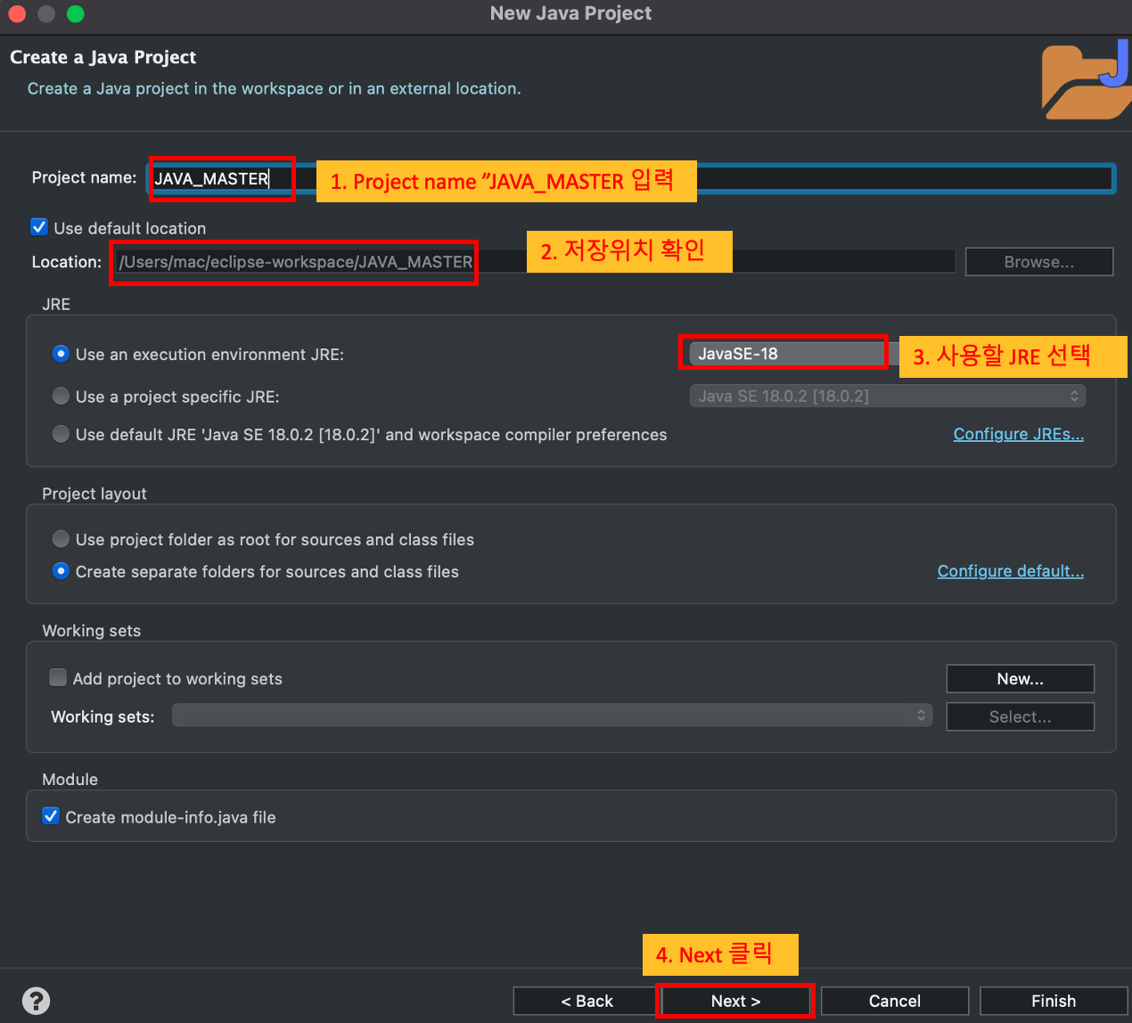 Project name 입력 -> 저장 위치 확인 -> JRE 확인 -> Next 클릭 -> Finish 클릭