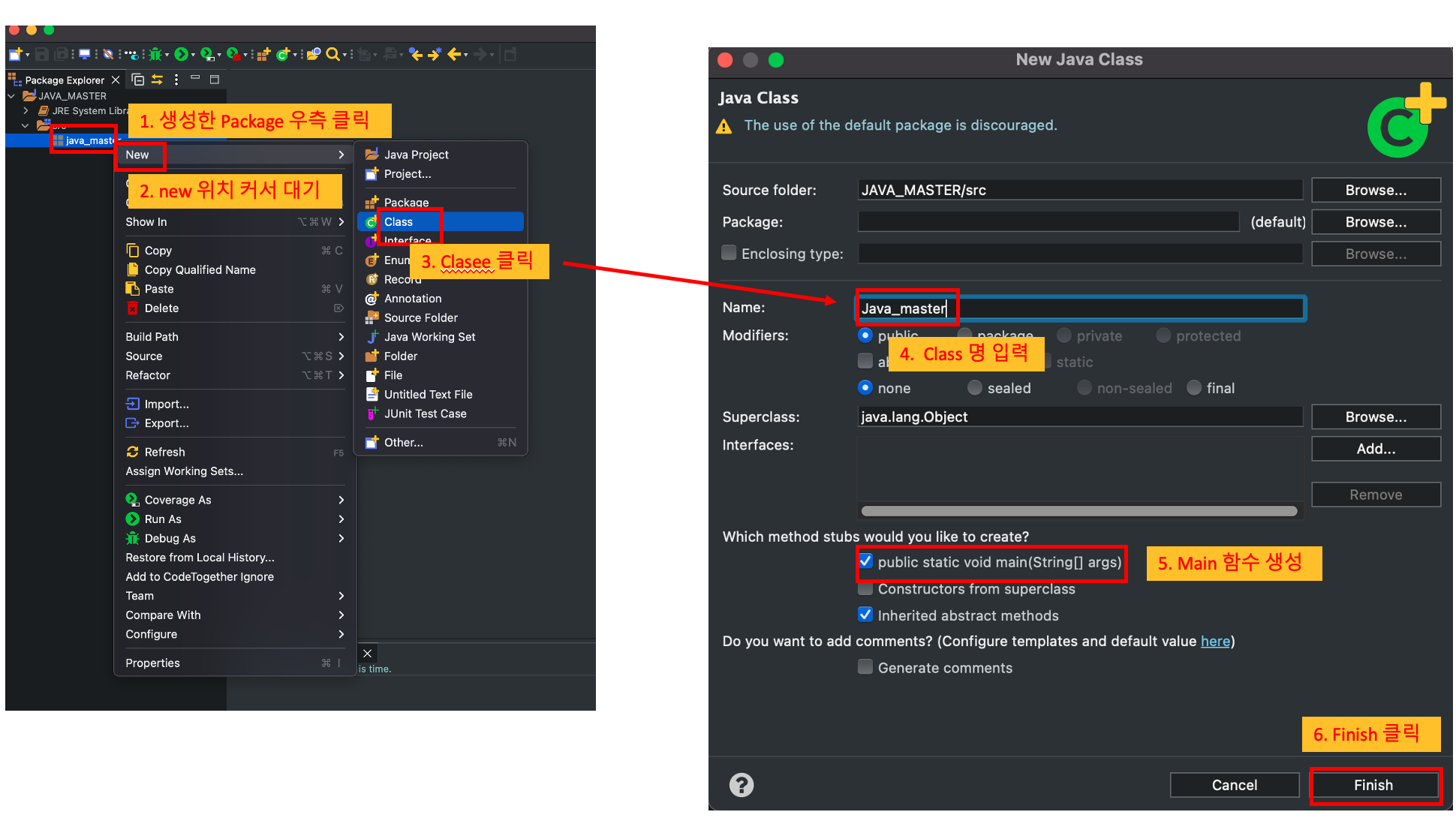 (첫 알파벳은 대문자로 입력_클린코드 지향) -> public static void main(String[] args) 체크박스 클릭 -> Finish 클릭