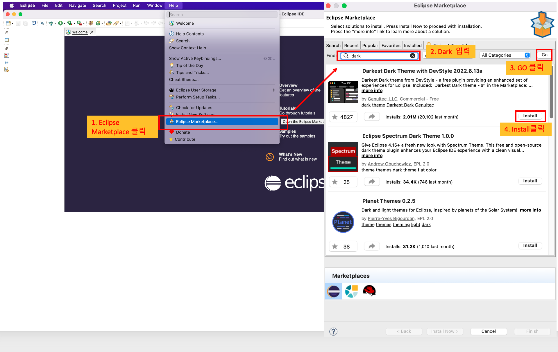 상단의 바에서 Help -> Eclipse Marketplace -> dark 검색