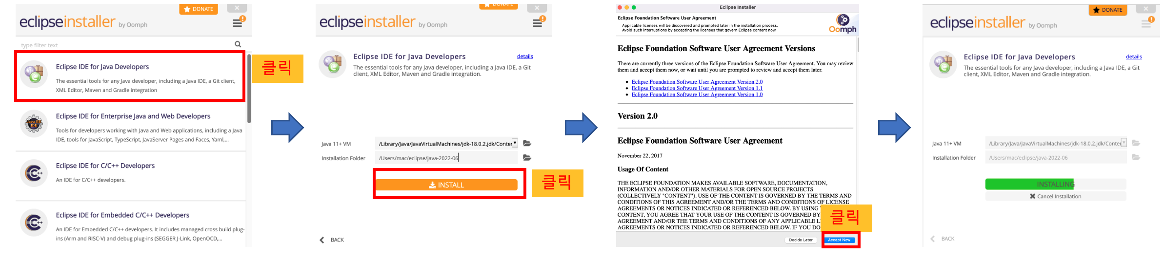 Installer 를 실행하면 다음과 같은 실행 화면이 나타나는데 Eclipse IDE for Java Developwers 를