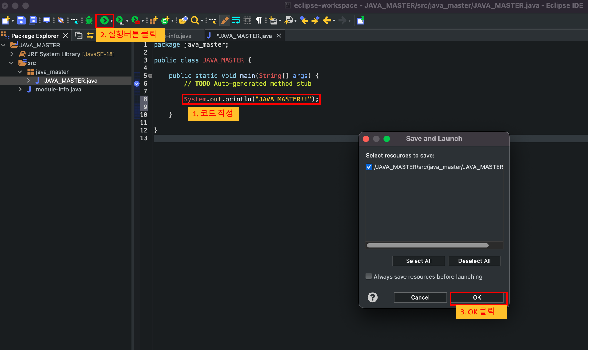System.out.println("JAVA MASTER!!"); 작성 -> 실행버튼 클릭 -> 저장 후 실행 화면에서 OK 클릭