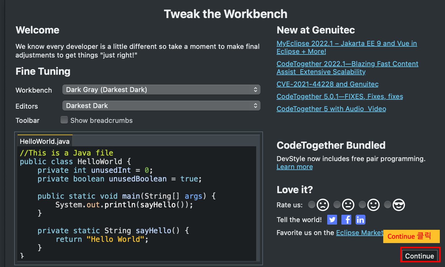 마지막으로 Workbench, Editors 테마를 지정하고 continue 를 클릭하면 설정이 완료된다.