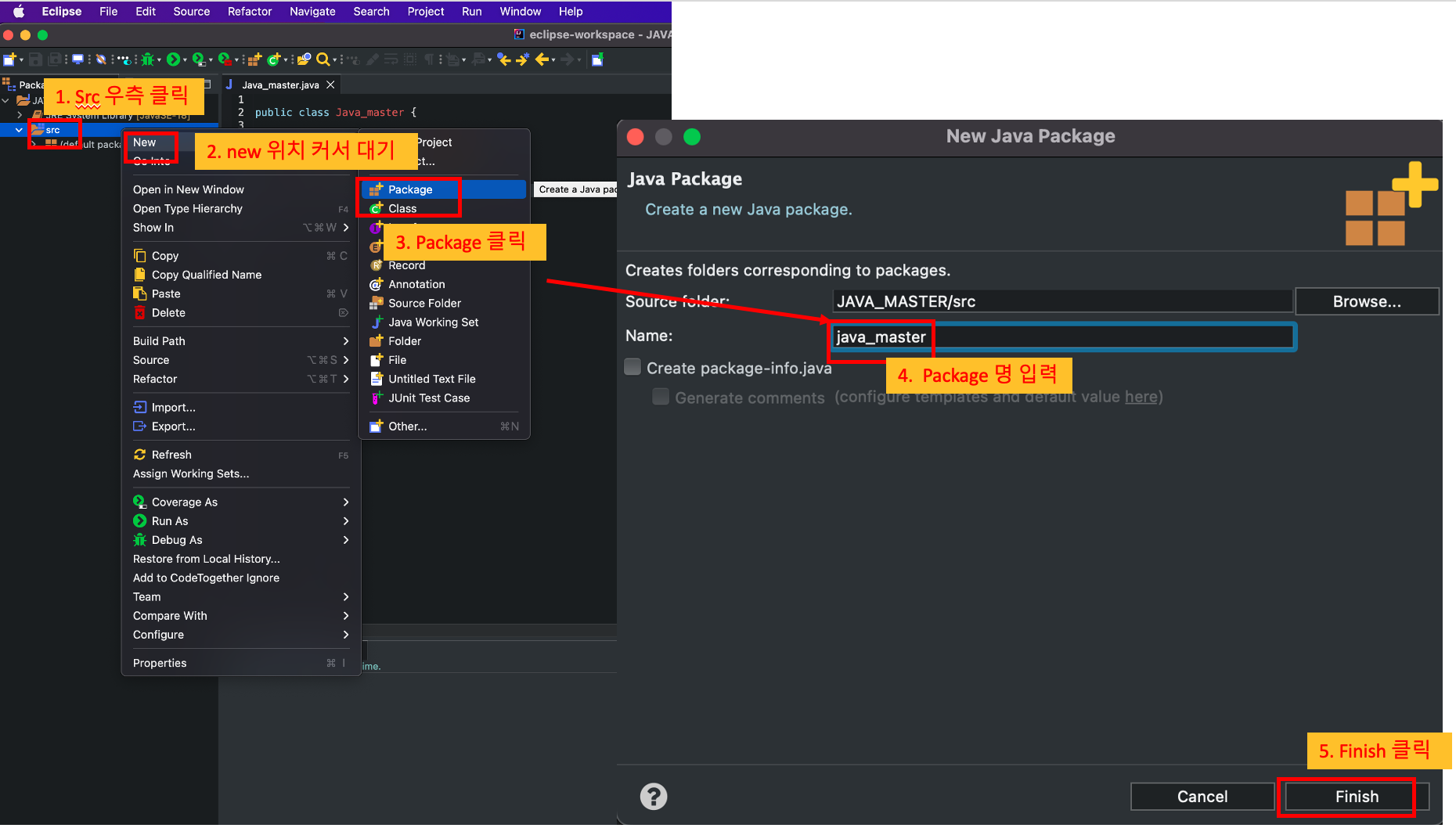 src 우측 클릭-> new 위치에서 대기 ->Package 클릭 -> Package Name 입력