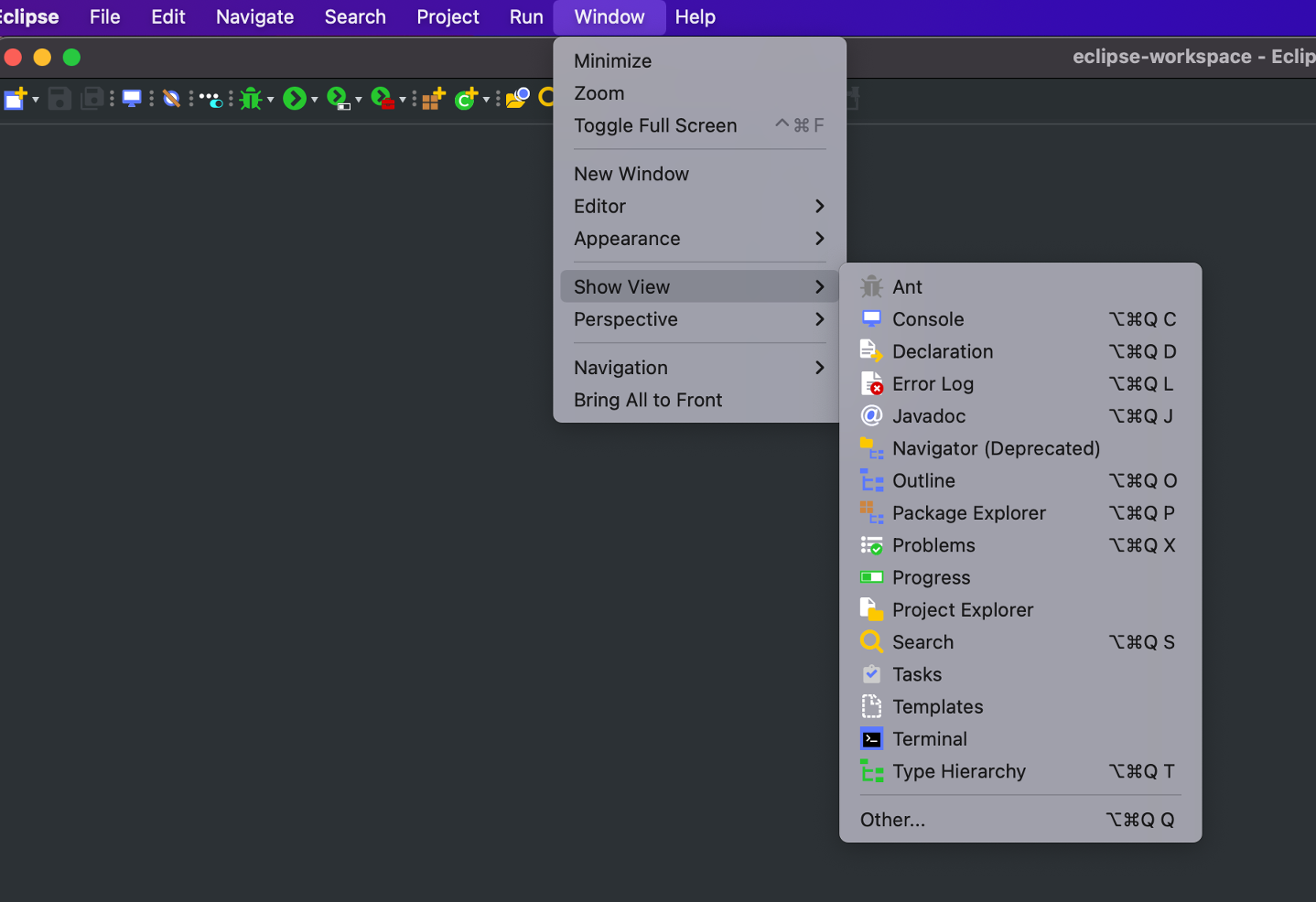 Eclipse 초기 메뉴바 설정이 되어있어 다양한 텝이 화면에 나타나는데,