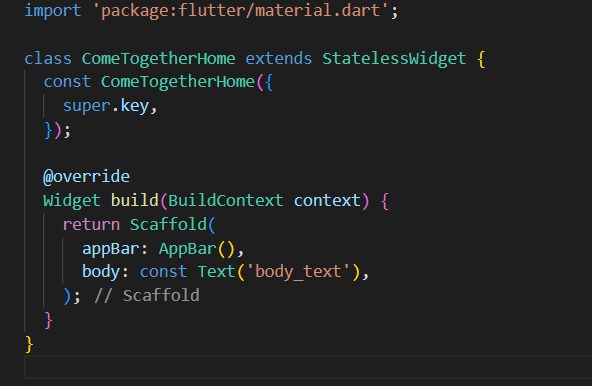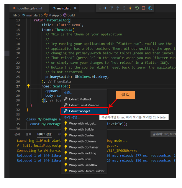 - main.dart 에서 scaffold(건설 현장에서 짓고 있는 건물 옆 작업자가 작업 할 수 있도록 하는 임시 구조물)를 클릭한 다음 컨트롤 + .(점) 을 눌른 후 widget 이름을 입력한 후 enter 를 누르면 auto generate 된다.