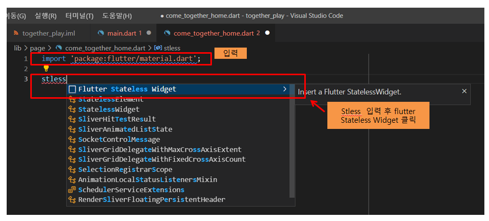 - import 'package:flutter/material.dart'; 를 입력한 후 엔터 stless 를 입력하면 Flutter Stateless Widget 메뉴 창이 뜨는 것을 선택한다.