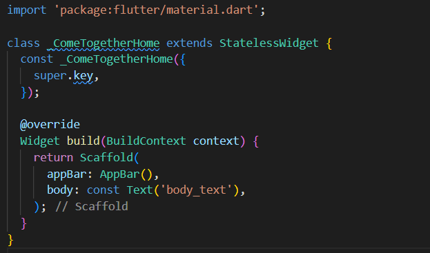 - 별도의 명시 없이 위와 같이 작성하면 public 위젯으로 import 만 하면 어디서든 사용 가능하다. 하지만 위젯이 파일 내부에서만 참조하여 사용될 경우, 클래스명 앞에 _를 붙여 private으로 사용할 수 도 있다.