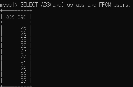 - ABS() : 주어진 숫자의 절대값을 반환