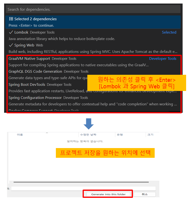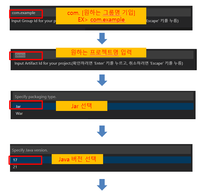 - control + shift + p를 눌러서 검색창에 > spring init을 입력하고 Spring Initializr: Create a Gradle Project... 클릭 후 다음과 같이 진행