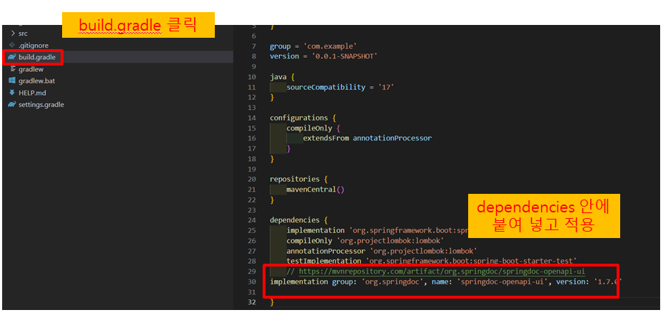 - VS Code 에서 생성한 Spring boot porject에서 build.gradle 클릭 후 dependencies 에 복사한 코드 붙여넣기 후 적용