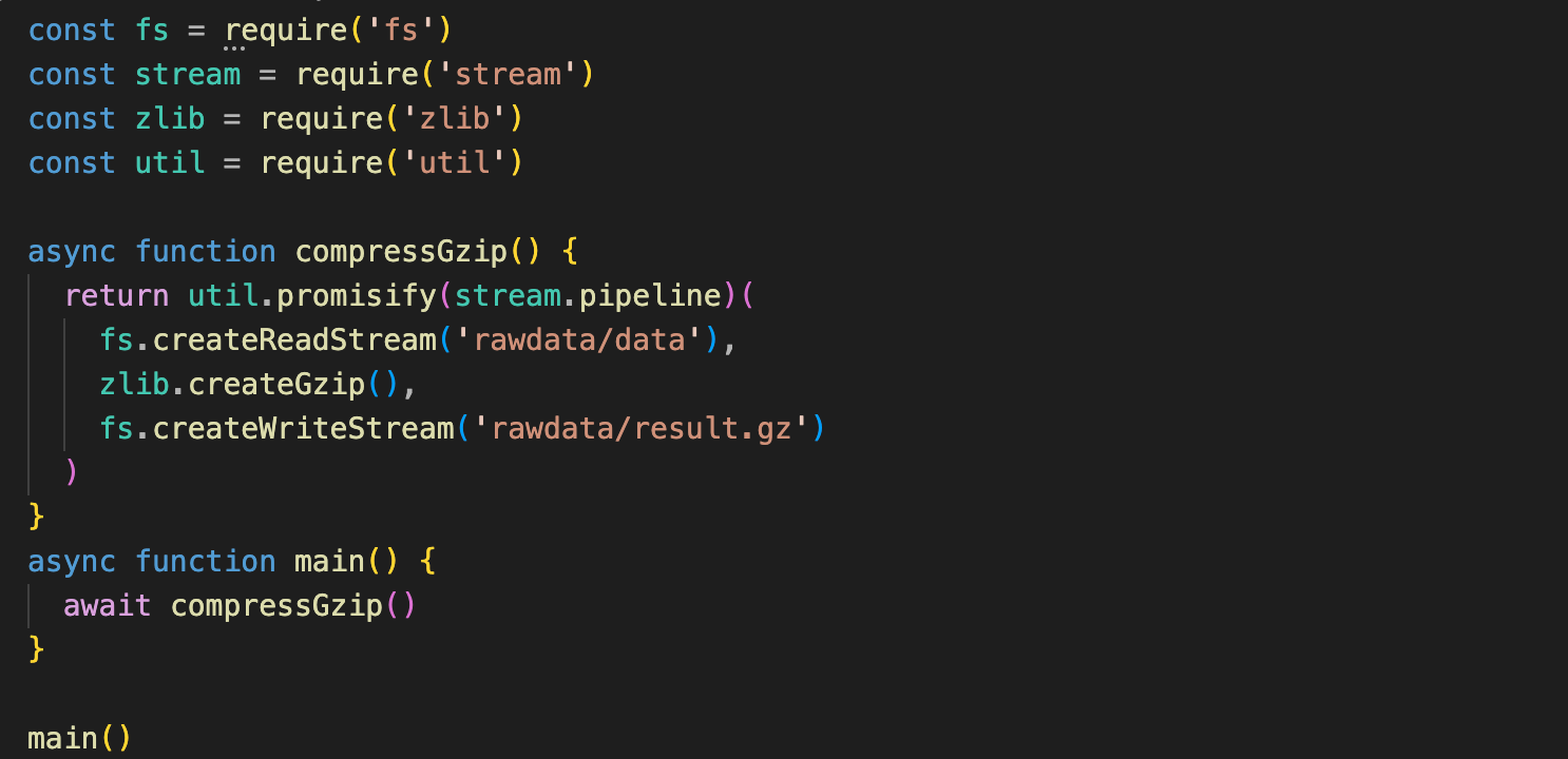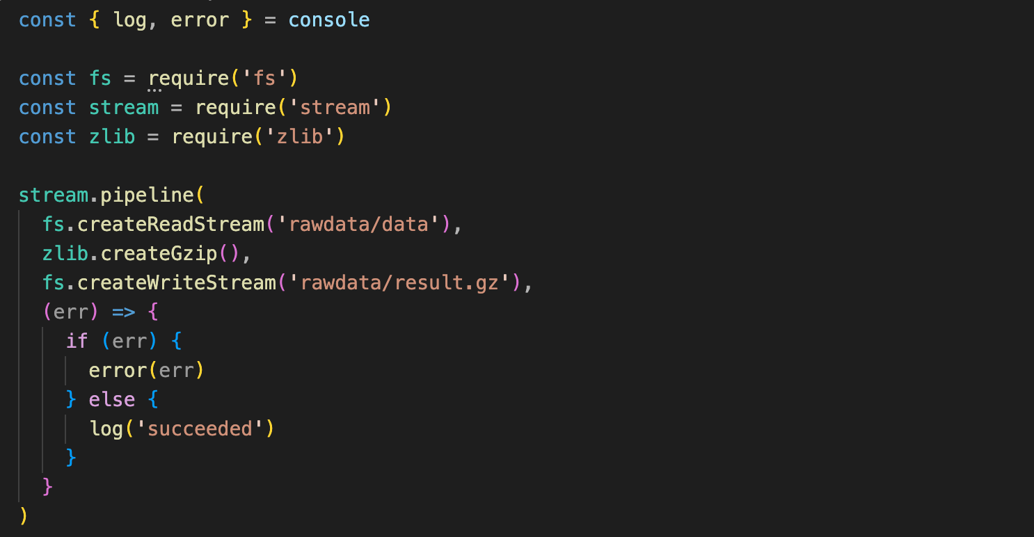 - 스트림을 통한 데이터 입력 후 압축, 압축 후 저장을 할 때, 비동기 처리가 필요한데 이때 pipeline 을 사용하여 순서를 지정(동기)할 수 있다.