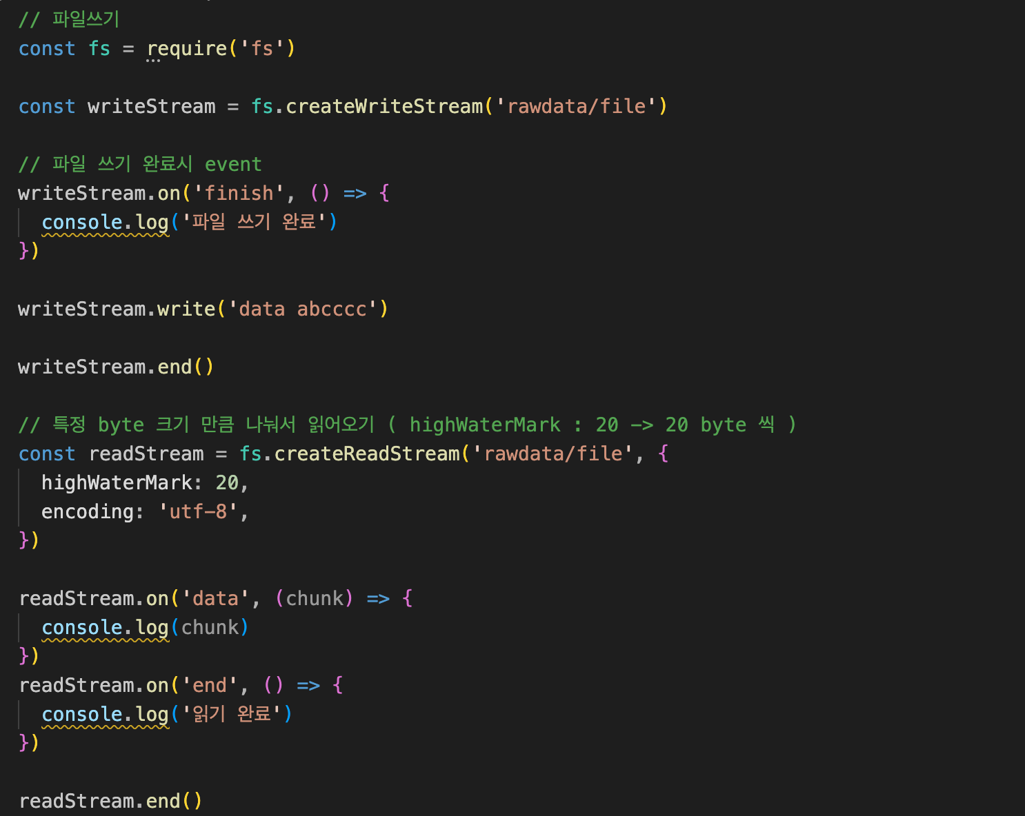 - highWaterMark 를 통하여 chunk 의 크기를 조절할 수 있다. ( default : 65536 )