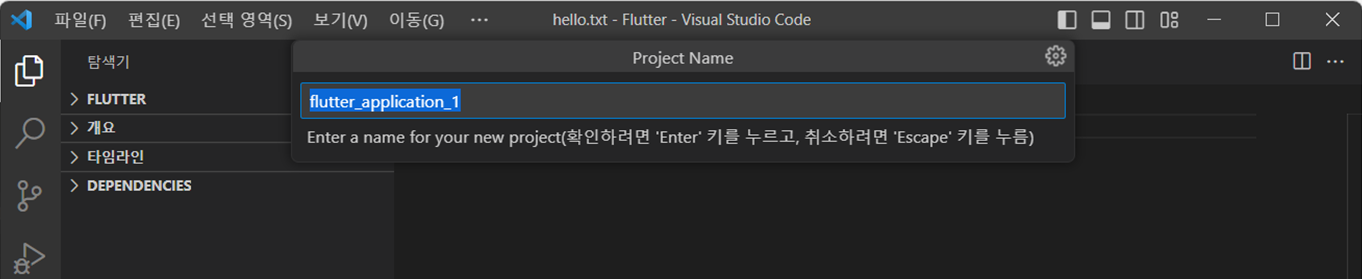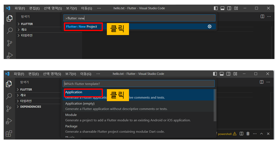 - 커맨드 창을 열어서 (ctrl+shift+p) flutter:new project 를 입력한 후 클릭한다.