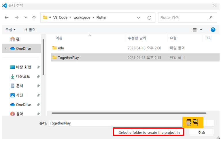 - 프로젝트의 위치를 설정 후 select a folder to create the project in 을 클릭 한 후 생성할 프로젝트의 이름을 입력한다.